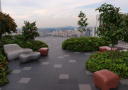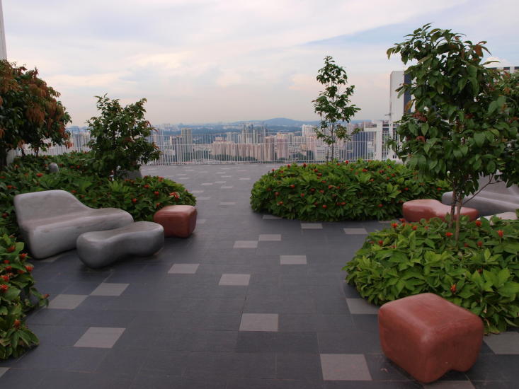 I 50. etasje strekker takterrassen seg langs siden av skyskraperne, over broer mellom bygningene, og iblant åpner den seg til mindre torg med planter, blomster og sofaer av stein.