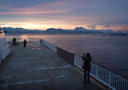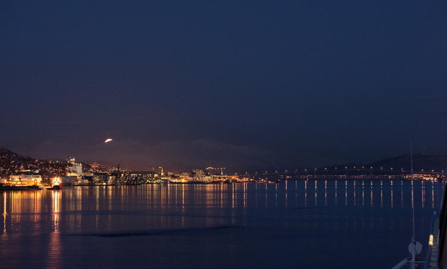 I femtiden, dagtid, kom vi til Tromsø. Månen glitret og speilte seg i sjøen. Og midnattskonsert i den vakre Ishavskatedralen.