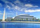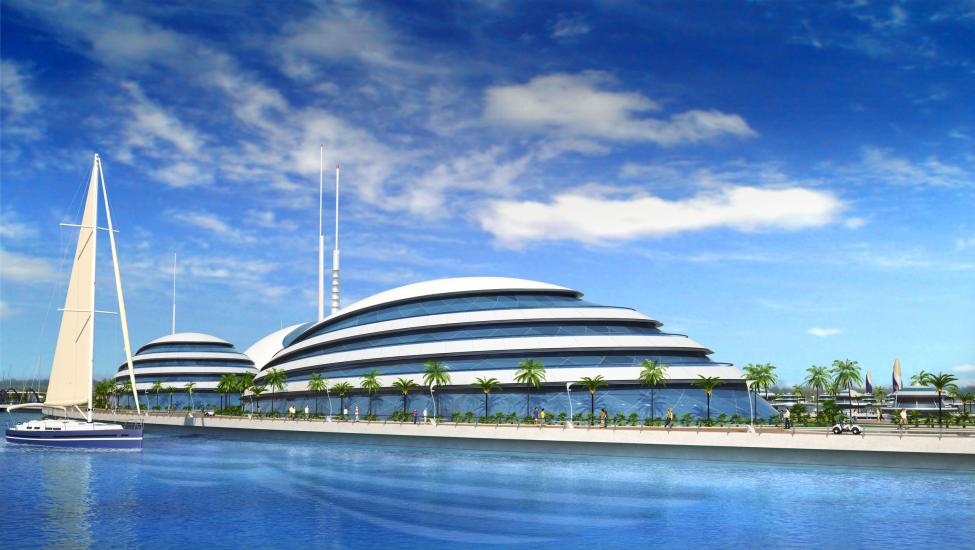 Sjødelen skal ha fire delvis nedsenkede, gigantiske hoteller med utseende som storslagne yachter - etter modellen å dømme ikke ulike Vikingskipet på Hamar.