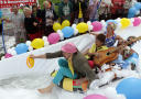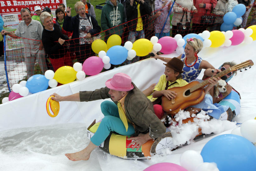 SLUTT PÅ SOMMEREN: Deltakere sklir først ned ei sklie på ei hjemmelaget flåte, for deretter forsøke å krysse en 13 meter bred dam med vann og såpeskum ved skistedet Bebrovy Log, like ved den sibirske byen Krasnoyarsk. Anledningen er feiringen av at det er slutt på den sibirske sommeren. Foto: ILYA NAYMUSHIN/REUTERS/SCANPIX
