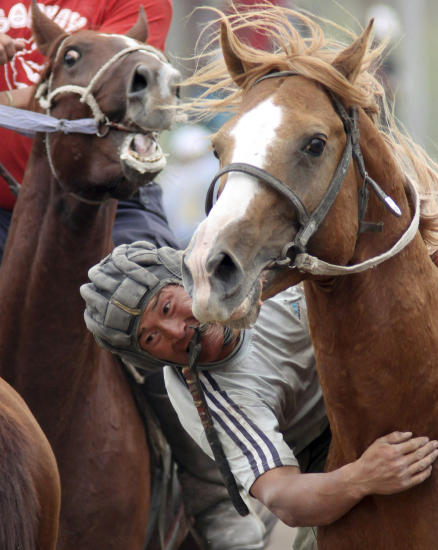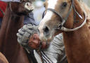 KOK-BORU: I forbindelse med Kirgistans uavhengighetsfeiring i hovedstaden Bishkek, ble det søndag avholdt en kok-boru - en geitedraingskonkurranse. Kok-boru er nasjonalsporten i Kirgistan og også en vanlig konkurranseform i resten av Sentral-Asia. Spillerne grabber rett og slett en geiteskrott fra bakken mens de rir i full galopp og forsøker få den i motstanderens mål. Det andre laget på sin side forsvarer seg som best de kan mens de griper etter den hodeløse geita, så de kan score i stedet. Foto: VLADIMIR PIROGOV/REUTERS/SCANPIX