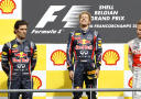 FORMEL 1: Red Bull Teamets Formel 1-kjører Sebastian Vettel, feirer seieren på Spa-Francorchamps i Belgia Grand Prix. På andreplass kom lagkameraten, australske Mark Webber, mens tredjeplassen gikk til McLarens Formel 1-kjører Jenson Button fra Storbritannia. Foto: THIERRY ROGE/REUTERS/SCANPIX
