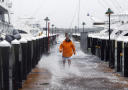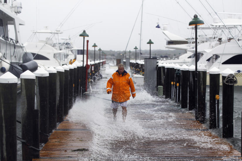 IRENE: Kaptein Jon Jedlicka sjekker båtene langs en dokk i Montauk ? New York, mens den blir herjet med av stormflo og vind under orkanen Irene. Foto: LUCAS JACKSON
