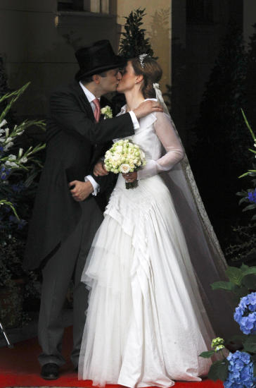 KONGELIG JA: Prins Georg Frederichog prinsesse Sophie von Isenburg av Prøyssen, kysser etter at de har gitt hverandre sitt ja i Fredskirken ved slottsanlegget Sanssouci i Potsdam. Den 35 år gamle prinsen er overhodet i fyrstedømmet Hohenzolleren, og er tippoldebarnet til keiser Wilhelm den andre. Foto: TOBIAS SCHWARZ/REUTERS/SCANPIX