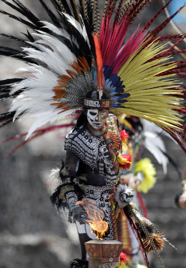 AZTEKERDANS: En meksikaner i aztekerkostyme, deltar i flammeseremonien i forkant av de panamerikanske lekene, ved de arkeologiske utgravningene ved Teotihuacan seks mil nord for Mexico City. Ilden reiser nå videre rundt i hele Mexico før lekene går av stabelen i Guadalajara fra 14. til 30. oktober. Foto: HENRY ROMERO/REUTERS/SCANPIX