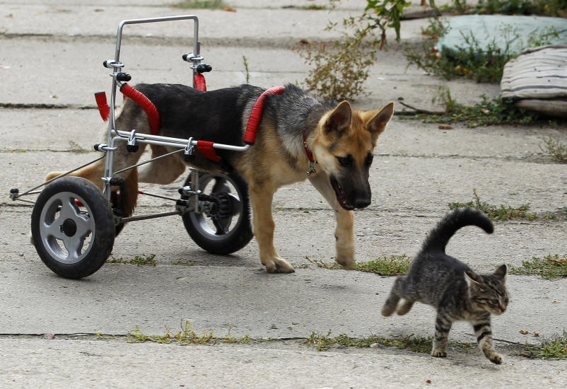 PÅ HJUL: Fire måneder gamle Ciuchcia jager en liten katt, etter at han har fått en spesiallaget rullestol ved Schronisko - et mottak for hjemløse dyr like ved Piotrkow Trybunalski i Polen. Valpen Ciuchcia ble lam i bakbeina etter at den ble fysisk mishandlet og etterlatt med sine to søsken på ei toglinje. Hunden overlevde til tross for at en rekke tog skal ha passerte på strekningen. Foto: PETER ANDREWS/REUTERS/SCANPIX