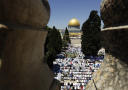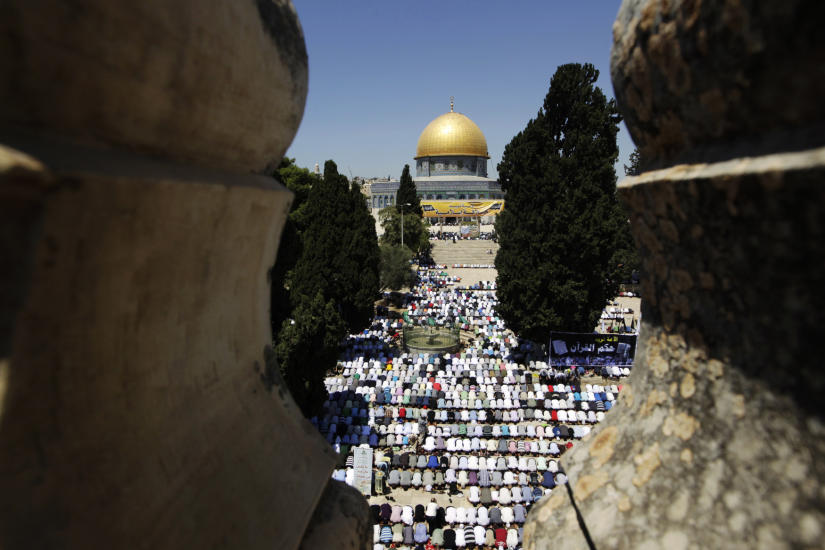 RAMADAN: Muslimer ber foran Klippedomen på al-Haram al-Sharif, eller Tempelhøyden, i Jerusalem den siste fredagen av den hellige måneden Ramadan. Domen markerer stedet hvor profeten Muhammad skal ha foretatt sin himmelreise. Foto: AMMAR AWAD/REUTERS/SCANPIX