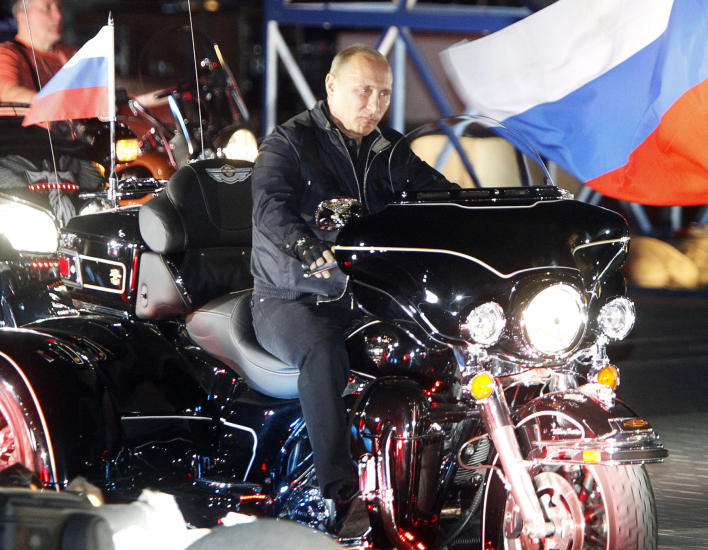 PÅ TO HJUL: Russlands statsminister Vladimir Putin, avbildet under sitt besøk på en motorsykkelfestival i den russiske byen Novorossiisk, mandag 29. august. Foto: SERGEI KARPUKHIN/REUTERS/SCANPIX