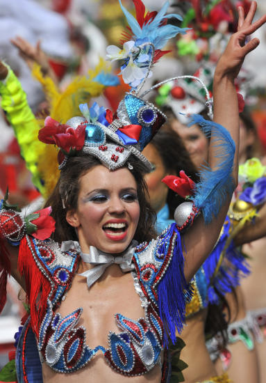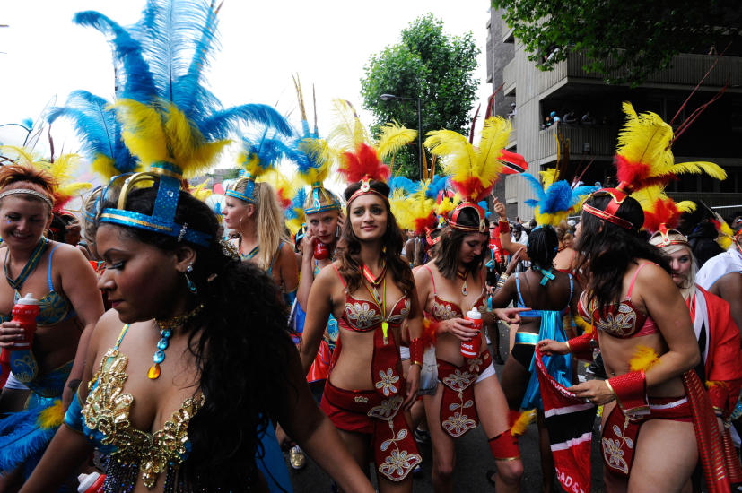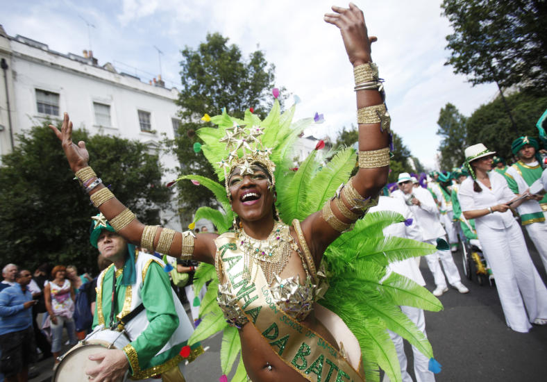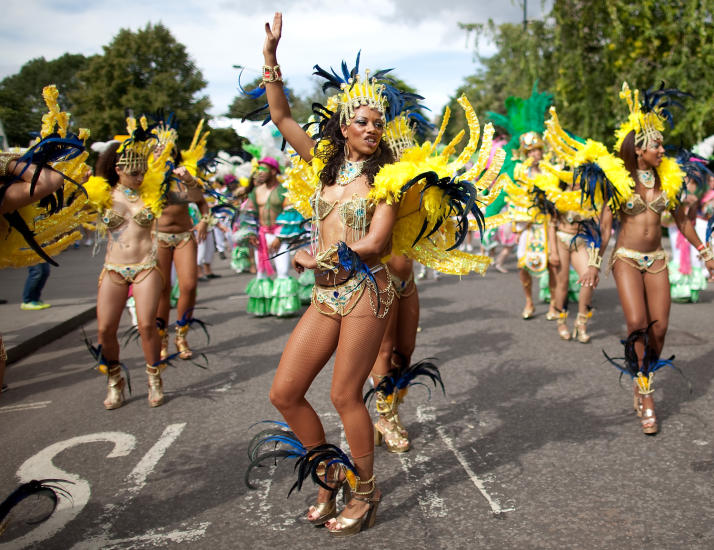 KARNEVAL: Fargerike dansere fylte gatene i det årlige Notting Hill-karnevalet i London søndag og mandag, i det som er den største gatefestivalen i Europa. Et rekordoppbud av polititjenestemenn, så mange som 6 500 dag nummer to, sørget for at det ikke ble noen gjentakelse av opptøyene som rystet den britiske hovedstaden for tre uker siden. Det hele er ifølge Reuters en feiring av den karibiske kulturen, og årlig trekker rundt én million mennesker ut i gatene for å delta i den fargerike prosesjonen med musikere og dansere. Foto: FACUNDO ARRIZABALAGA/AFP/SCANPIX