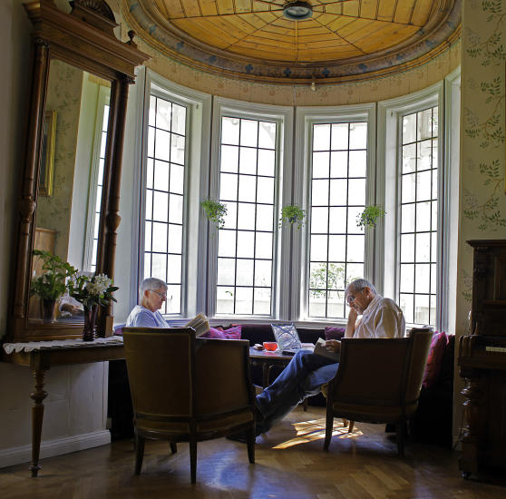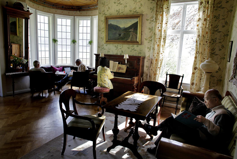Innenfor er det meste på stell. Pent og tidsriktig, som om tiden har stått nesten stille i hundre år.Fra salongen hører vi kjente klavertoner av Edvard Grieg, som tolkes særs vakkert.