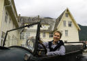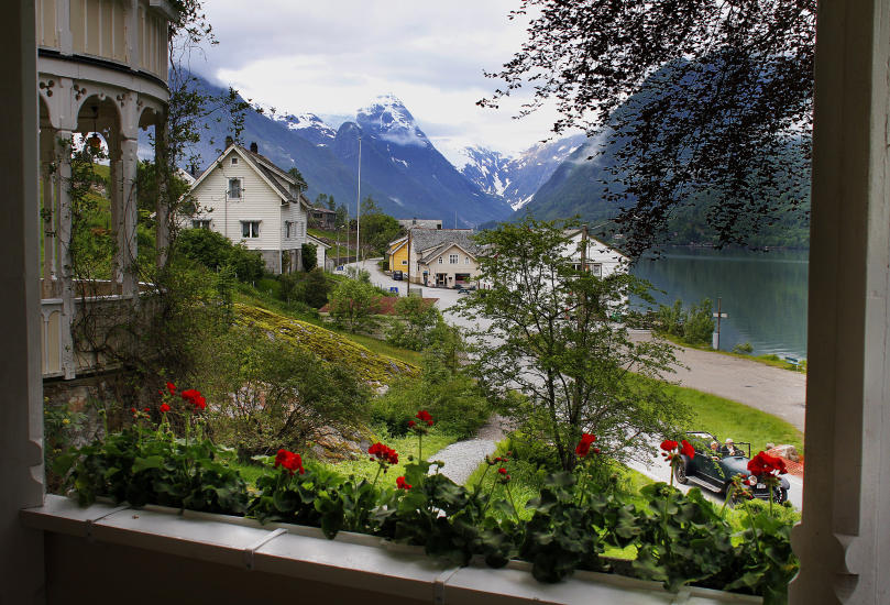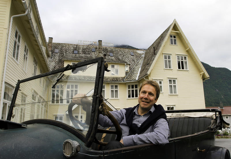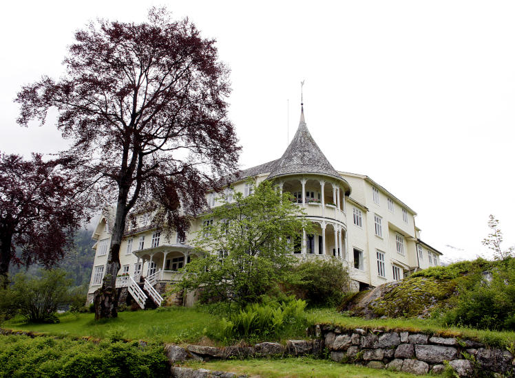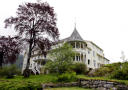Et par svinger til og det store hvite trehotellet i sveitserstil framstår med spir og elfenbensfarget eksteriørprakt.