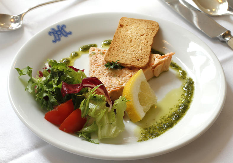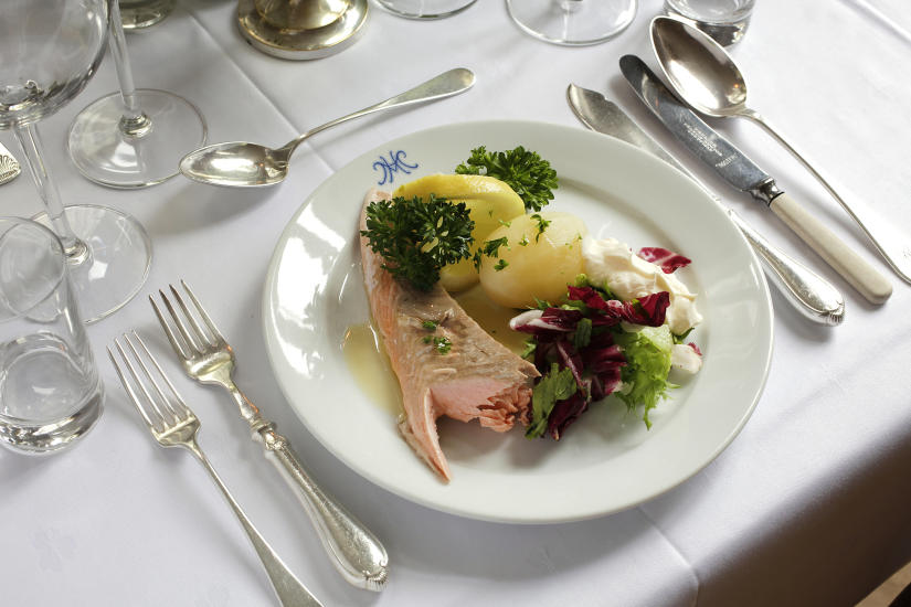Først lunsj. Helkokt ørret. Spektakulært på sølvfat og meget godt. Servert med Altenkirch Riesling 2007, tørr og riktig.En rundtur i hotellet, eller museet om du vil, er en vandring hundre år tilbake i tid.