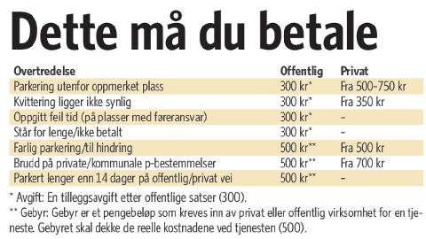 De offentlige aktørene er stat og kommune, og de opererer generelt med lavere avgifter enn de private selskapene.De gir 300 kroner i tilleggsavgift dersom du parkerer bilen utenfor oppmerket plass der det er avgiftsbetaling.