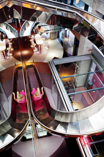 Som en buktende metallskulptur finner den veien ned til lobbyen.