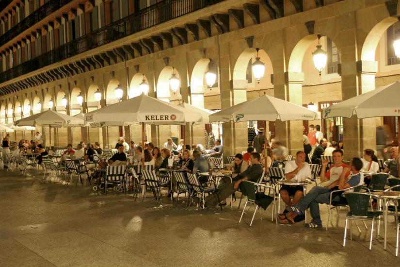 KAFÉKVELD: Plaza de la Constitución i gamlebyen er omkranset av kafeer der det koker av liv på kveldene. Foto: KJERSTI GJEMS VANGBERG
