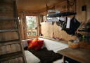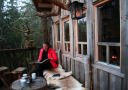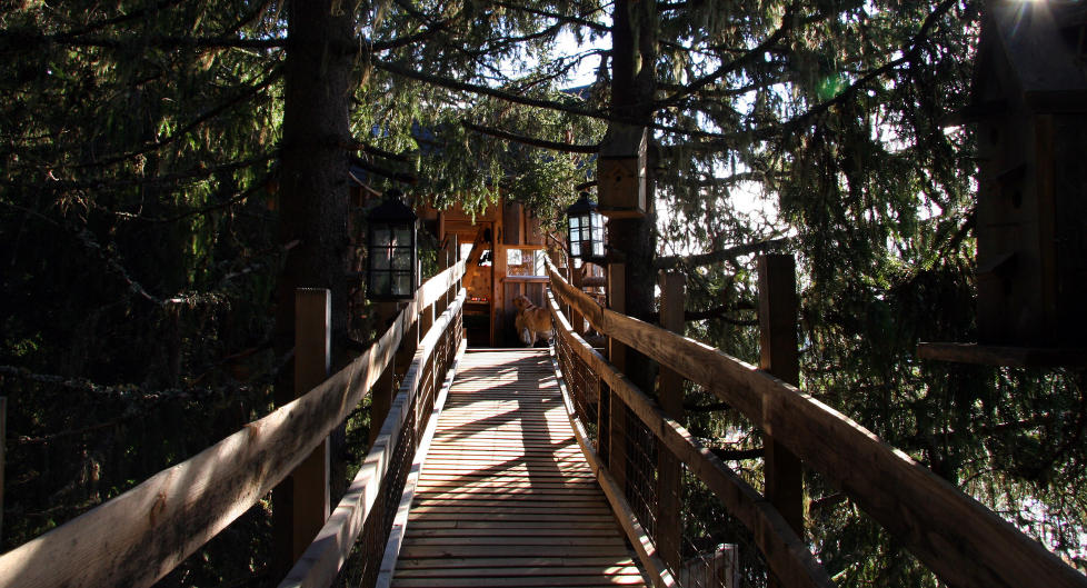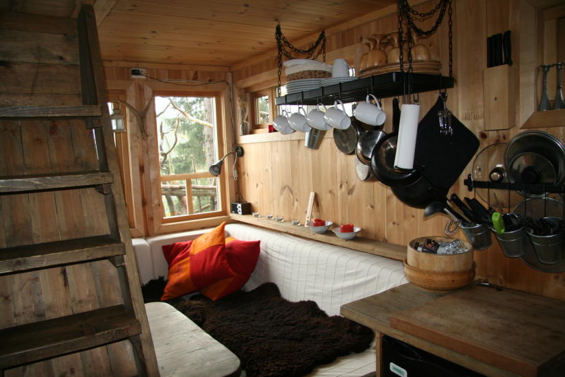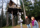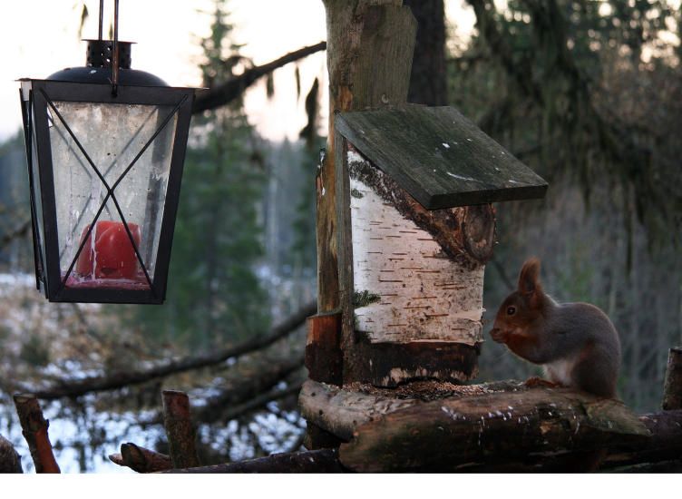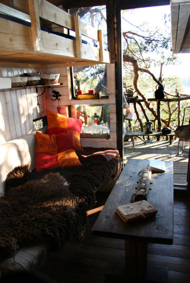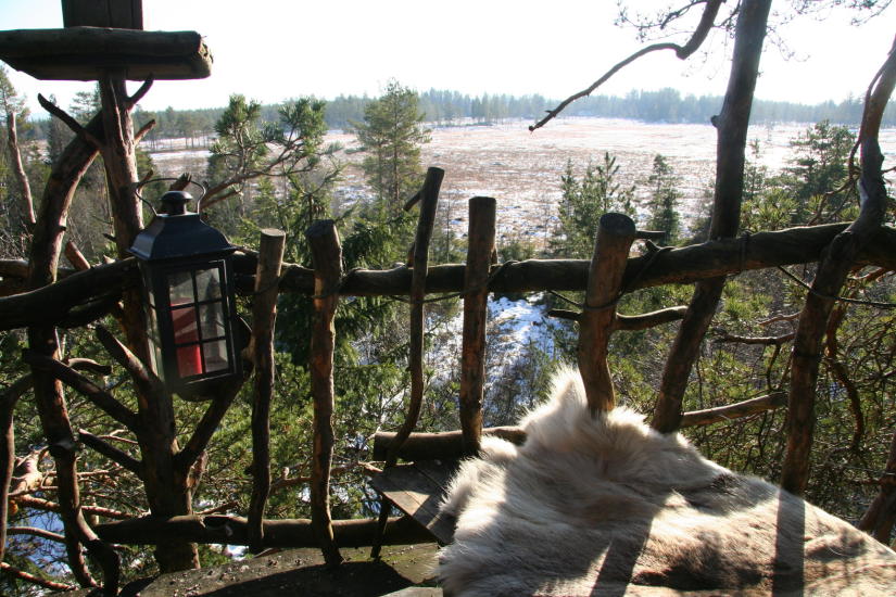 De får følge av små granmeiser og finker etter hvert som dagen lysner.Vi bor oppe i toppen av et tre, i Lerkehytta, en av Norges første offisielle tretopphytter.