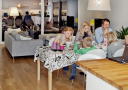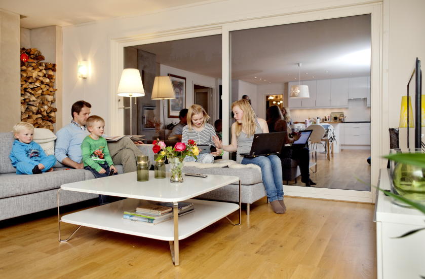 Familien tilbringer mesteparten av tida sammen i allrommet. Her lages mat, spises, tittes på tv, leses, gjøres lekser og jobbes, turnes og lekes.