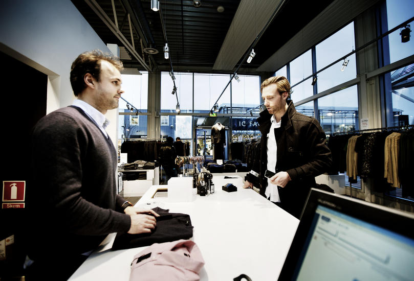 Hun presiserer at det bare er fjorårets kolleksjoner. For det er flere butikker på Freeport som faktisk får inn varer fra årets kolleksjoner også.Plutselig kommer det en kunde. Joakim Pihl. Han er så svensk at han burde jobbet på Grünerløkka. Sleik, velkledd, kanskje litt hektisk.