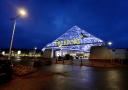På et neonskilt under pyramiden flimrer stedets budskap forbi: «Varmt välkomna. Alltid upp till 70 prosent på alle varor. Stort lekrum for barn. Välkända varumärken».En riktig outlet, er slagordet. Freeport er navnet. Men hvor er alle shopperne?