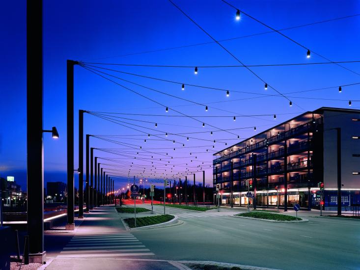 Om prosjektet: Byen Raisio var litt som Drammen i gamle dager; byen du helst kjørte forbi. Fabrikkbyen med en lang og stolt historie trengte et løft. Ved hjelp av Vesa Honkonen, arkitekten som de siste årene også har markert seg sterk innenfor lysdesign, forsvant følelsen av Raisio som et forblåst og ugjestmildt sted. Prosjektet vakte først motstand, men ble så stor suksess at en rekke byer ønsker noe liknende. 220 små lyspunkter festet til et nett av kabler skaper en stjernehimmel for de gående og en lystunnel for dem som kommer kjørende. Skjult belysning bak vann som renner ned på metall skaper en egen stemning om kvelden. Nye gatelykter er festet i søylene som står tett og skaper avgrensning mot 60-tallsblokkene i betong i området rundt.