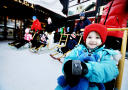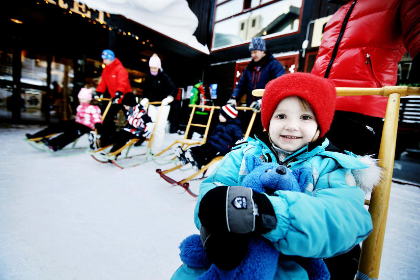 Det suses nedover en bakke, under ei bru. Kirken passeres. Snart er de forbi alpinbakken.Barna sitter på. De voksne sparker. Et sted på veien holder det på å gå galt.