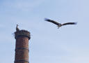 Og der kommer de. To stykker. På vei mot sitt nye rede i den gamle fabrikkpipa.