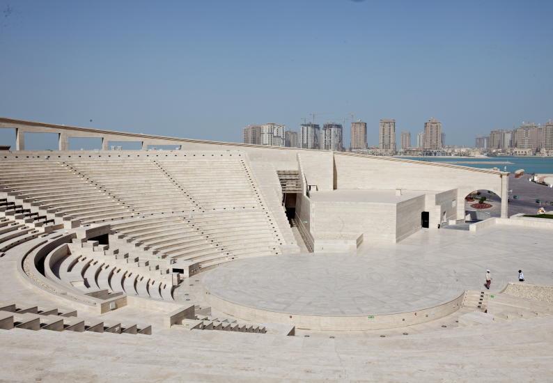 Fra parkeringsplassen bringer den lille golfbilen oss lydløst og gratis inn i en verden som ikke fantes for få år siden. Det er som om en usynlig gud har sagt «bli kultur», og på et blunk skapt ny opera, nye teatre, ny moské.