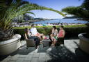 De to parene labber ned mot strandflekken sin for å jobbe videre med brunfargen etter pausen med forfriskninger og fersken mellom palmene.
