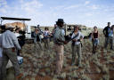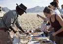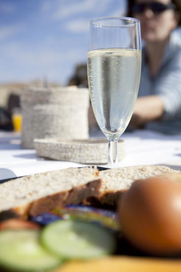 Etter halvannen time med intens fotografering og to landinger i ørkenen, er det klart for frokost. Bakkemannskapet har arrangert frokost à la «Mitt Afrika», med hvite duker og champagne midt i ørkenen.