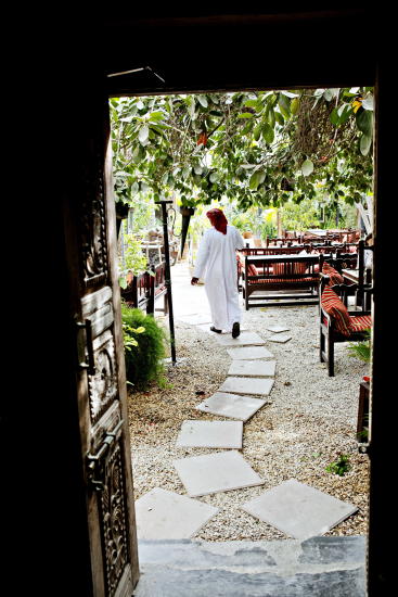 Damene sitter tett i tett i sofaer, snakker lavmælt og flytter skjeer med kaker inn bak sløret. Mennene foretrekker ofte den frodige hagen, med vannpipa på bakken og en blås vanilje eller anis.Rashid snakker med München i det ene øyeblikket, London i det neste. Tyskerne og britene har for lengst fått øynene opp for Oman. Italienerne, sveitserne og østerrikerne kommer etter.