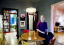 Skjulstad lener seg inntil vinduskarmen i stua. Den er like rosa som alt annet av vegger, tak, lister og stukkatur.