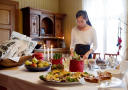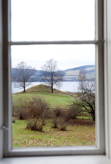 Nå bærer hun flere fristende matfat ut fra det korallrøde kjøkkenet. Fra vinduene ser vi Mjøsa danse rolig inn i sola, bak tretoppene skimtes den snart 900 år gamle Ringsaker kirke.