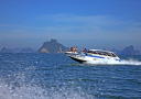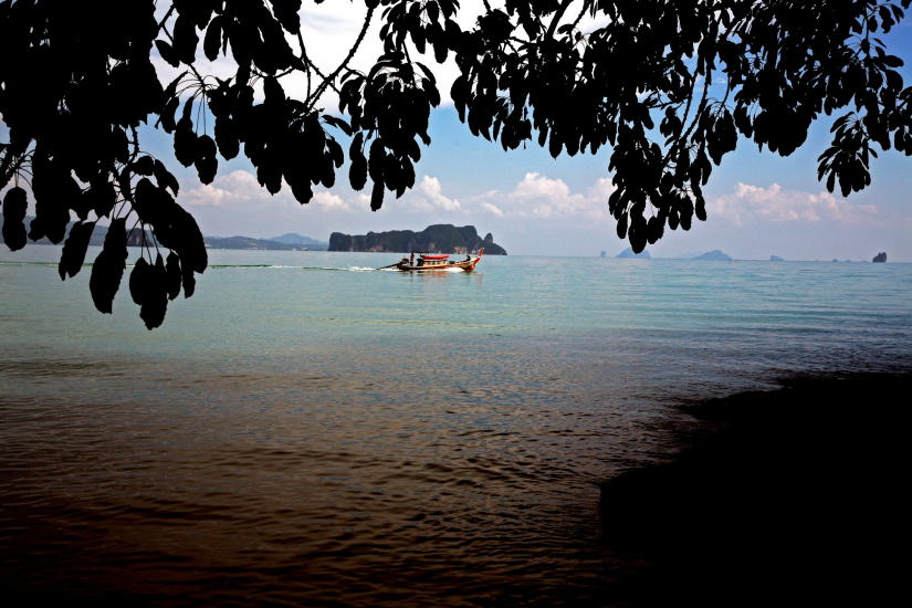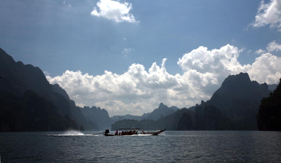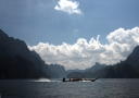 FERD: En longtailbåt passerer forbi naturskjønne fjell. Foto: EIVIND PEDERSEN