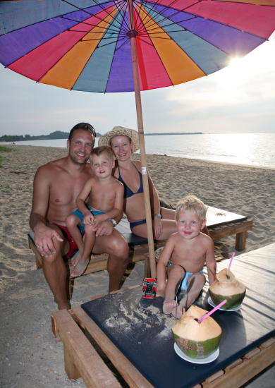 STRANDLIV: Ungene Christian (2) og Henrik (4) koser seg på stranden Pakveep i Khao Lak, sammen med mamma Jannicke (31) og pappa Fredrik HMøller (36) fra Stavanger. Foto: EIVIND PEDERSEN