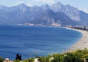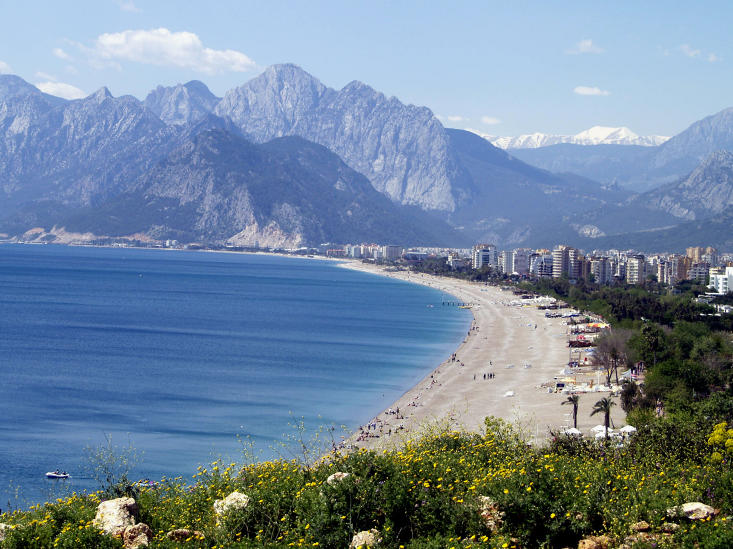 TYRKIA - Antalya: Snittprisene på hotellrom på den tyrkiske rivieraen falt med hele 25 prosent i fjor, melder Budget Travel. Ifølge nettstedet er Antalya dermed det naturlige valget for den budsjettreisende. På bildet er stranda Konyaalti i provinsen, med en del strand, en del by og en del historie. Foto: BOZALTAN/CREATIVE COMMONS/CC BY-3.0