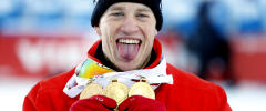 FIRE GULL OG EN BRONSE: Emil Hegle Svendsen poserer med fangsten i VM, fire gullmedaljer og en bronse.