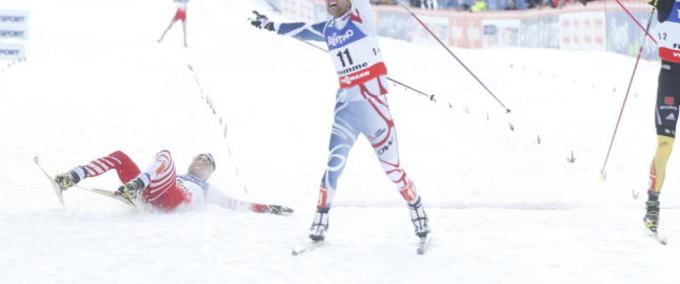 Det så ut som om de norske løperne ikke hadde perfekte ski på dagens langrenn. Da tetgruppa på fem løpere skled ned mot skistadion var Klemetsen den eneste løperen som ikke skled med.