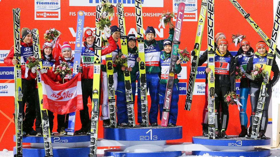 Lagkonkurranse hopp (HS106), blandet lag: 1) Japan 1011,0 - Yuki Ito 218,2 (90-91,5), Daiki Ito 259,1 (100-100), Sara Takanashi 267,5 (101,5-106,5), Taku Takeuchi 266,2 (100,5-101,5), 2) Østerrike 986,7 - Chiara Hölzl 230,7 (92,5-98,5), Thomas Morgenstern 256,1 (99,5-100), Jacqueline Seifriedsberger 245,3 (97,5-99,5), Gregor Schlierenzauer 254,6 (99-100), 3) Tyskland 984,9 - Ulrike Grässler 236,9 (96,5-97), Richard Freitag 256,3 (102,5-97), Carina Vogt 240,8 (95,5-98), Severin Freund 250,9 (96,5-99,5),