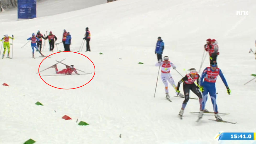 STIV OG SLITEN Her faller Ingvild Flugstad Østberg på sin sisterunde. Dermed ble avstanden opp til USA, Sverige og Finland for stor for de norske jentene, og de måtte nøye seg med fjerdeplassen. Foto: Gjenngitt med tillatelse fra NRK