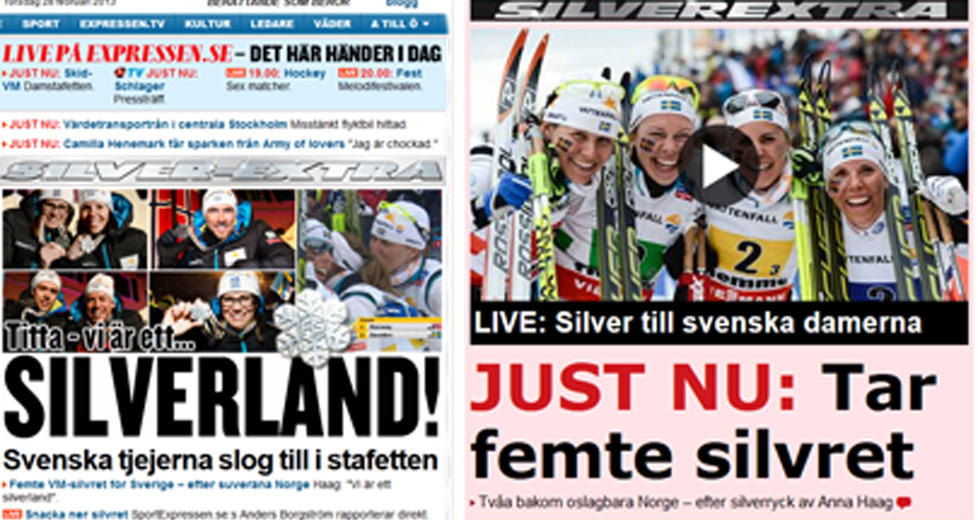 «Titta... Vi är ett SILVERLAND!» skriver Expressen på sin nettforside etter at Charlotte Kalla gikk de svenske stafettjentene inn til et nytt sølv i dag.