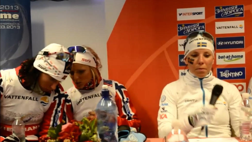 «Det er mye», mumlet Johaug til Bjørgen under pressekonferansen etter rennet, og det suverene stafettgullet ble glemt i et sekund eller to.