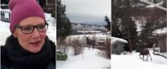 Elghunden Birka (11) har reist seg opp på to bein. Nå står den med forpotene på kjøkkenbenken og skotter! ut gjennom vinduet, lykkelig, helt ut i den krøllete haletuppen ved synet av fem elger i hagen. Hvis bare alle elgene i nabolaget hadde skjønt at det var bedre å !komme hit og få servering i trafikksikre omgivelser, istedenfor å reke rundt nede ved veien..... Men nei. Denne vinteren har vakttelefonen til Olbergsveen ringt både to og tre og fire ganger om dagen.