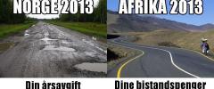 Og det er ikke helt sikkert at «Afrika 2013»-bildet heller er tatt i år. Fotograf Bill Hatcher hevder på sin Facebook-side å ha tatt bildet av veien som skal representere Afrika. Han mener å ha tatt bildet mellom 1991 og 1992 og at veien ligger i Lesotho i Sør-Afrika.Hatcher mener veien ble finansiert av et Sør-Afrikansk vannprosjekt, og at veien umulig kan ha blitt finansiert av norske skattebetalere.