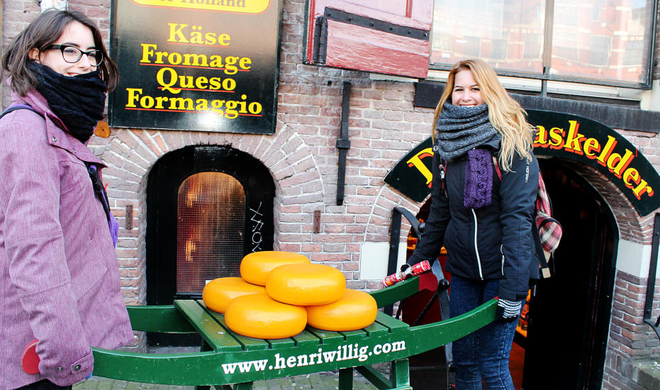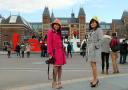 De to jentene står tynnkledde foran Rijksmuseet i vårkulda, hvor nyplantede tulipaner kjemper om en plass i sola.