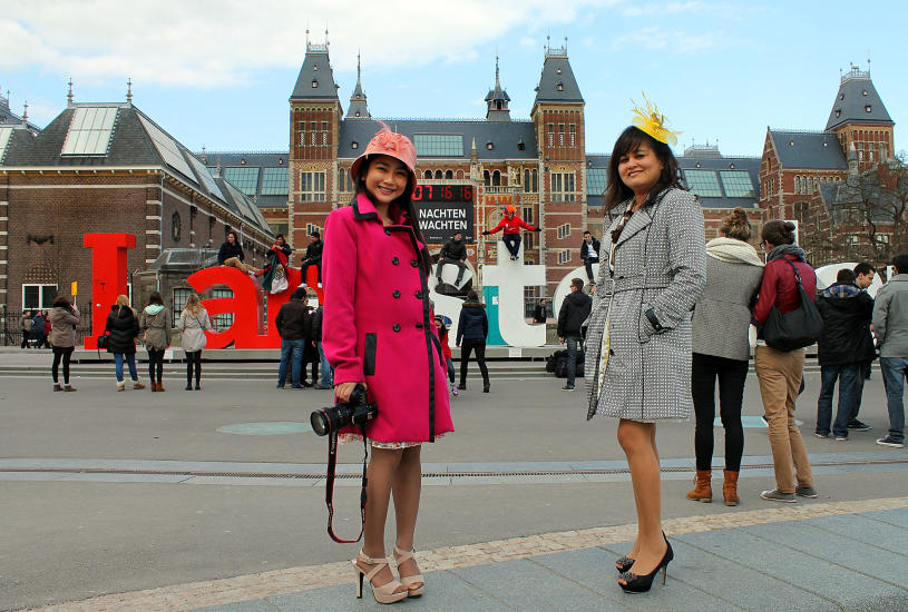 AMSTERDAM: Turister fra hele verden har samlet seg foran Rijksmuseet, som åpner offisielt i dag, mens turistene først slipper inn i morgen. Her er det Julie og May fra Manila som benytter anledningen til en fotoshoot foran verdens mest berømte museum. Foto: KIRSTEN MARGRETHE BUZZI
