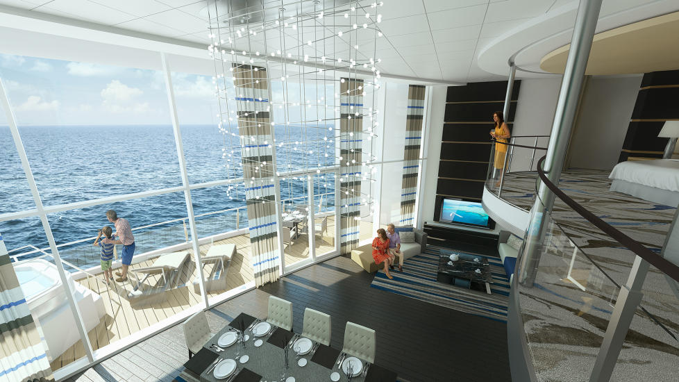 • En annen attraksjon er en to etasjer høy vindtunnel i glass der du kan kjenne hvordan det er å fly der du svever fritt i luften.• 373 lugarer på innsiden får virtuelle balkonger - der levende bilder fra utsiden vises på den ene veggen.