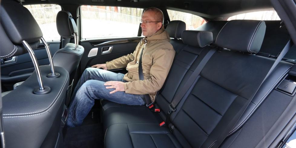 Også i baksetet er plassen sjenerøs. Det som særlig skiller E-klasse fra de to hovedkonkurrentene, er at her er det tre personer kan sitte best. I de to andre er setene mer formet for at to skal sitte godt. Tredjemann er det ikke så farlig med.