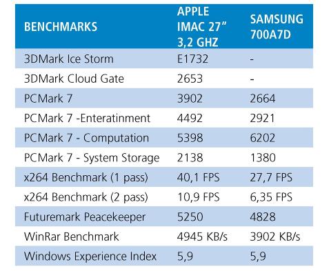 Siden vi må sammenligne denne maskinen med andre alt-i-ett-PC-er, har vi gjort testene med Windows 7, installert via Apples egen Bootcamp (som for øvrig er en usedvanlig smertefri og velfungerende løsning for å kjøre to samtidige operativsystemer på Mac).Tallene viser at Imac-en yter meget bra. Skal vi fortsette å sammenligne med Samsung 700A7D, ser vi en langt bedre grafikkytelse i tillegg til en bedre harddiskytelse. Prosessoren er også litt kvassere. Denne Imac-en drar det meste av spill med høye kvalitetsinnstillinger. Samsungens grafikk ligger for øvrig på nivå med grafikkløsningen til 2,9 GHz-versjonen av Imac.