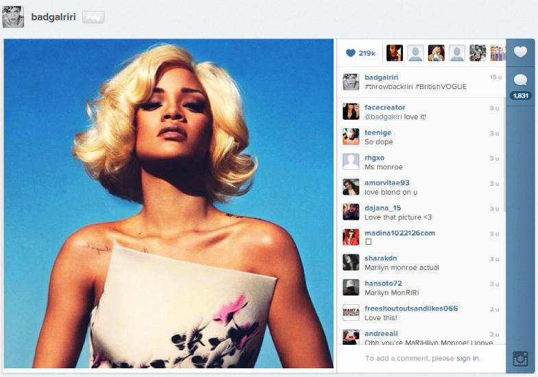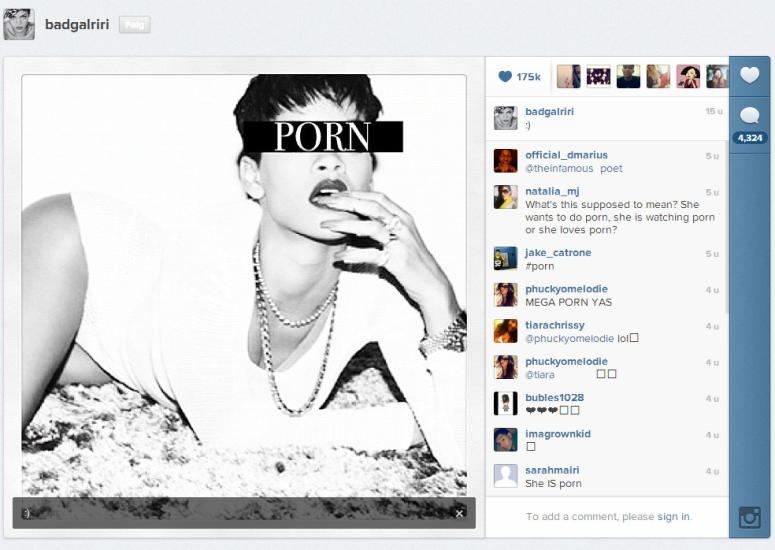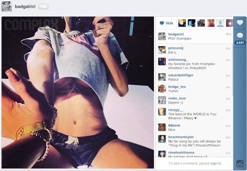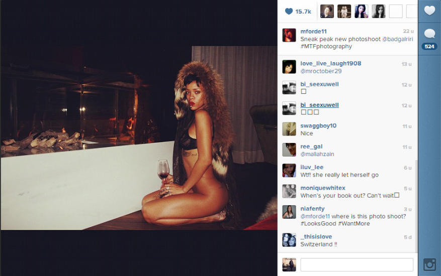Parfymen heter «naken», og Rihanna fra solskinnsøya Barbados bruker ikke mye klær, verken når hun opptrer eller når hun legger ut bilder av seg selv på Instagram. Rihanna dokumenterer nesten daglig livet sitt på denne deletjenesten. Livet som Rihanna har et forbløffende spenn: Fra lesing av bibelvers til hasjrøyking og besøk på strippeklubber. Det er denne «ærligheten» som har ført til at stadig flere mennesker som oppdaterer seg på nyhetsbildet og været også bryr seg med å sjekke hva Rihanna har gjort i dag.