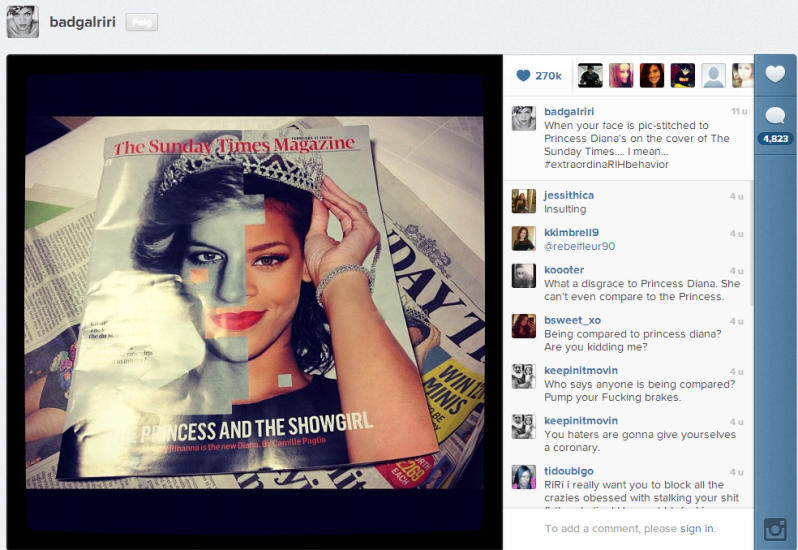 Og dermed er jeg tilbake til Camille Paglia igjen. Hvorfor velger denne profilerte feministen å idolisere nettopp Rihanna? Paglia tolker åpenbart Rihannas doble budskap som et tegn på kontroll, og har valgt å legge mer vekt på selvhevderen enn på offeret. Eller på offeret som selvhevdende - Paglia skrev en kontroversiell artikkel i Sunday Times i fjor, der hun sammenliknet Rihanna med avdøde prinsesse Diana. Paglia påpekte at disse to kvinnene delte skjebne på flere plan. Begge var elsket av - og forelsket i - kameraet, og brukte fotografiet til å sende ut beskjeder om hvordan de hadde det, eller i det minste: hvordan de ville at verden skulle oppfatte at de hadde det. Diana poserte i majestetisk ensomhet foran Taj Mahal i India da det ble kjent at Prins Charles lenge hadde hatt en elskerinne. Rihanna sto med senket blikk i badedrakt på en balkong på Barbados etter bruddet med Chris Brown. Paglia ser en styrke i denne selviscenesettelsen og mener det er et kunstnerisk talent å være et seksuelt objekt. Både Rihanna og prinsesse Diana, skriver hun, har brukt fotografiet til å vise seg som tiltrekkende, trassige og hevngjerrige.
